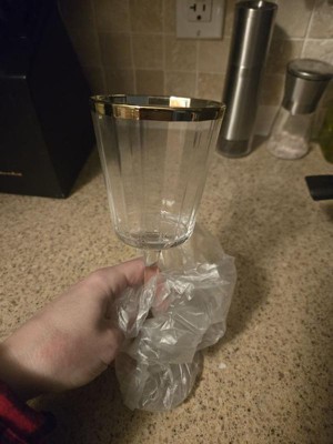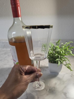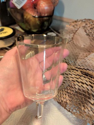 Enhance your barware collection with this Faceted Stemmed Wine Glass from Threshold™. Made of glass, this transparent wine glass features a faceted design and boasts a gold-tone rim for an elegant touch. It has a capacity of 9.1 fluid ounces and can be used to serve a variety of cold beverages in addition to your favorite wines.
