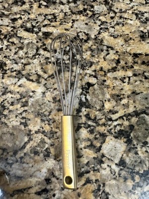This golden whisk is on the smaller side but gets the job done. Looks nice in the kitchen with other coordinating tools. The downside is after only a few uses the gold handle has started to fade and visible scratches on it.