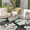 Stylish outdoor rug with a vibrant tropical leaf pattern.