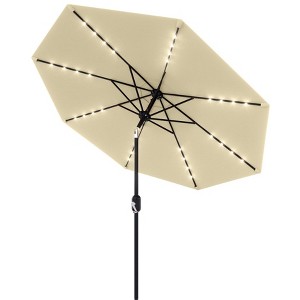Solar Powered 9FT Offset Patio Umbrella with | 32 Auto-Charging Bulbs, 8-Rib Steel Frame, Tilt Crank, UV Resistant ; Waterproof for Deck, Garden, Cafe
