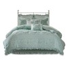 For a cottage chic look in your space, the Madison Park Mindy Comforter provides color and style. The dusty seafoam center has quilting and ruffle details while the outer border features a floral print in white and finishes off the edge with ruffles. Two euro shams and three decorative pillows use coordinating colors and fabric manipulation techniques to pull this whole look together. Items in the set may come in a rolled or compressed packaging, which will need to be fluffed up or steam ironed before use to remove wrinkles.