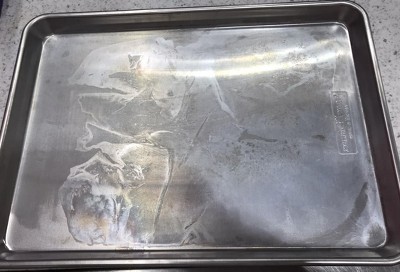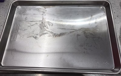 This sheetpan is scratched. I am returning it and hope another, unscratched, is in stock.