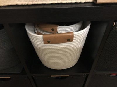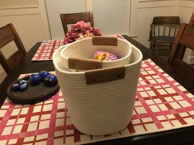 Very attractive, functional and versatile basket. Love the handles and style. Faux leather handles can be removed. Lightweight. Comes in different sizes. This is not my first purchase and have noticed they can vary slightly in shape or height. Wish they were offered in more colors.