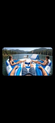 this was honestly one of the best purchases i’ve made! it was so much fun out on the lake and was a great way to relax with everyone nearby swimming. it’s a 7 seater but at one point we even had 9 of us lounging on it. it’s very sturdy, i had no problems at all blowing it up, it’s just very big so i’d recommend blowing it up with a car air pump cause u won’t be able to fit it on top of a car. I highly recommend this product, im so happy i got it and have no regrets with this purchase.