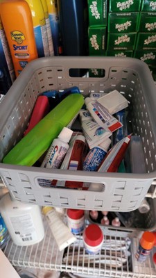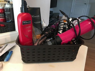 I got this for bathroom items and they work wonderfully! Because they are made of plastic, they wipe clean whenever something spills - which can't be said about most other baskets! The tight weave keeps everything inside and the color matched perfectly with our light grey walls! There is also a space between the handle and the top of the basket to put labels. We used a label-maker to label ours, but you could also tie on a cute tag with a label of what is inside! "I received this product as part of a My-Take research study."