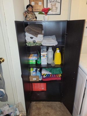 [This review was collected as part of a promotion.] Perfect just what i needed to store office supplies and craft/picture stuff! adjustable shevling and fixed! gave plenty of space on shelving for boxes and stacks of supplies. durable shelving made of sturdy material. beautiful dark espresso color match other office decor and furniture. two door cabinet easy to assemble and door open and close smoothly. instructions included, heavy cabinet! Once placed it is to stay put! would love another one for extra pantry in kitchen as well! would be great for dishes and can goods! deep shelving.