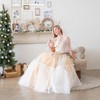 Our officially licensed Mattel Holiday Barbie ™ Premium Adult Dress. Celebrate the magic of the holidays in our stunning gown to commemorate the 35th Anniversary! From the rich, shimmering gold lame' bodice to the voluminous skirt with gold printed stars, this gown is a radiant symbol of joy, style, and the enchantment of the season. The soft organza capelet with satin tie is the perfect finishing touch. Invisible side zipper closure. Keepsake quality. Made in USA. Also available in child sizes.