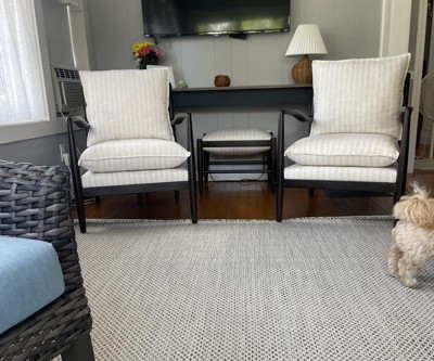 The first chair ordered was defective, so I was unable to put it together. The hole in the arm was drilled in the incorrect spot. The 2nd chair received, all of the stripes were not straight or lining up, as it looked like the cushions were poorly sewn, and the seat cushion was sew lopsided. I ended up returning the chair and ottoman, which had the same issue with the stripes.