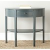 Brighten an entry hall or living room with the country casual Abram Console. Crafted of pine in shabby chic dark teal, this demilune console features a discreet drawer and lower shelf for collectibles or magazines. Straightforward lines make Abram a transitional must have.