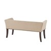 Description Accent your home with the simple elegance of the Madison Park Welburn Accent Bench. Upholstered in a tan color fabric, this bench features a low back and flared arms that create a sleek and sophisticated look. A bronze nailhead trim adds elegant accent, while the light wood finish complements the upholstery. Perfect for your bedroom or living room, this upholstered bench provides a chic update to your home decor. Assembly required. Product Details See below Overall:49.5inW x 19.25inD x 23inH Seat:40.25inW x 15.75inD x 17.5inH Arms:40.25inW x 23inH Back Rest:49.5inW x 5.5inH Leg Height:11.4in Clearance under Bench:11.4in Maximum Weight Capacity:400 lbs Material Material: Solid wood and plywood frame and Solid wood leg, upholstered seat and back Cushion or Upholstery Fill Material: Foam Fabrication: 92% polyester, 8% linen Wood Finish: Morroco