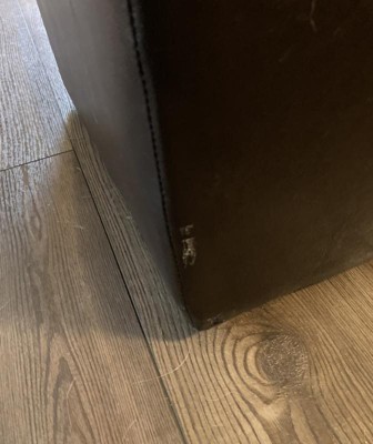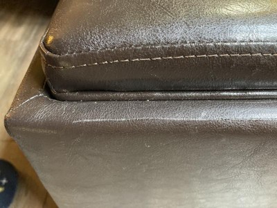 This is a nice sturdy piece. It came with two marks in the “leather.” The spots aren’t terribly noticeable. I took pictures of them. Too much trouble to return. I have dogs and I figure it will be marked up by one of them soon enough. I like that it has the tray on it. We have two small tables next to the chair and loveseat, so this is a nice option for an extra place to set things down. The top isn’t very cushy, but it is softer than putting your feet up on a coffee table.