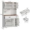 - Designed for busy households, this kitchen pantry offers 8 cabinets with height-adjustable shelves and 2 deep drawers, making it easy to store and access cookware, food, and utensils. Reinforced with anti-tip hardware and sturdy panels, it safely supports daily use. The farmhouse design complements modern or classic interiors and provides a seamless storage solution whether you use it in the kitchen, dining area, or living room. The built-in charging station (2 AC outlets, 3 USB ports) keeps gadgets and appliances powered while keeping cords out of sight.