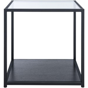 A favorite of contemporary designers, this Ackley End Table is effortlessly styled to suit any rooms decor scheme. Ackleys understated open black frame is perfectly paired with a sleek tempered glass top, and its bottom shelf provides ample space for storage or display.