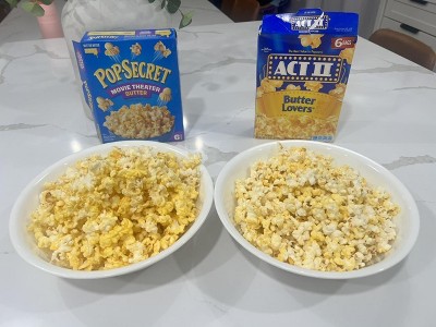 Bland and sad-looking compared to the other brand. However, if you’re sensitive to salty flavors like I am (taste-wise, not medically), I’d suggest sticking with this one, because I found the other to be a bit too salty. We ended up mixing both to balance it out. I don’t think I’d buy this one again. As for the other, I’d go with the next level down. LEFT: Top Secret RIGHT: Act II