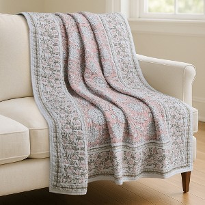 The Adare Reversible Throw by Levtex Home is inspired by distinctive fashionable wall coverings. Offered in taupe and blue, this design will immediately transform any room in your home. This throw features beautiful flowers in bloom and vines with a distinctive border all around on the front, reversing to a striped border floral vine design on a cream ground on the back. The Throw (50x60in.) has a cotton front and back, filled with a cotton-rich filler, and is machine washable. Enjoy this for years to come!