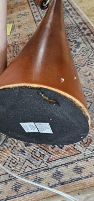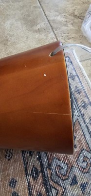 Item arrived with a crack at the bottom of the lamp, near the back. The weight and everything internal to the lamp was falling out of the bottom where the felt was trying to hold in a very heavy weight it couldn't support. The color of the wood stain is not anything like the photos. Very orange, not the more muted color in the photos. The lamp works, but other than that, I'm less than thrilled for a $300 purchase.
