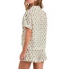 • A: The pajama top features a short sleeve design with a notched collar and a button-down front.
