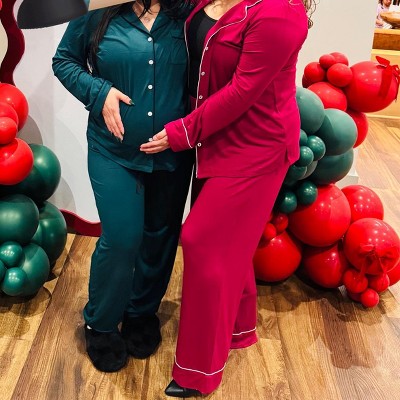 This sleepwear set includes a top with a notch collar, long sleeve, contrast piping details, and fabric-covered buttons, as well as a pant with an elastic waistband for added comfort. A timeless holiday pajama set for cozy Christmas mornings or a thoughtful gift.