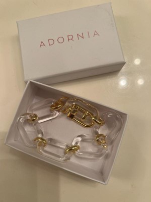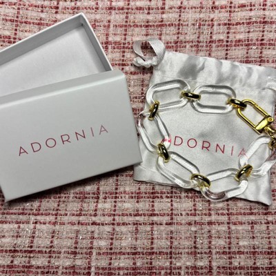 [This review was collected as part of a promotion.] This Adornia clear link bracelet is prettier than pictured. Not a fan of the clear links, but they are mixed with elevated gold links and clasp. All together it works. It came nicely packaged in a draw string silk bag and jewelry box. Nice presentation.