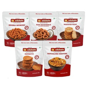 Adukale Traditional Crunchy Savory Snack Combo – Bangalore Mixture, Khara Muruku, Kayi Kodubale, Maddur Vade & Nippattu = 5 Variety Pack