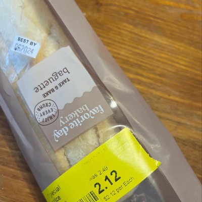 Bring home the bread with Take & Bake Baguette from Favorite Day™. This classic French delicacy makes a tasty addition to your plate with its crusty outer and soft inner that make it perfect for a wide range of recipes. After baking in the oven for warmth and toastiness, baguette bread can be a delicious companion to a soup or salad, or a foundation to your favorite sandwich. You can even add it to a charcuterie or bruschetta spread with plenty of fixings like olive tapenade, red pepper jam, honey goat cheese and more. With approximately six servings per container, this take-and-bake-bread is perfect for sharing or enjoying over multiple servings.