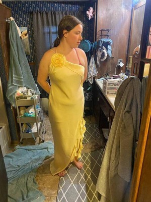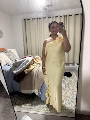 Turn heads with the Aila Rosette One Shoulder Dress in Butter Yellow. This elegant maxi dress is all about effortless sophistication, featuring a chic one-shoulder neckline and thin adjustable straps for the perfect fit.