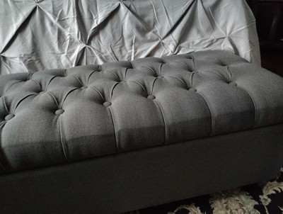 I purchased this ottoman to store blankets. The two blankets that were stored on the far ends of the ottoman are now stained with dark black dust of some sort. I imagine it is a result of the hinges rubbing against the inside material of the ottoman over time. Regardless, I now have a weighted blanket and a large white plush blanket with several black marks on each. I am not quite sure how to get the stains out and I’m afraid to keep my other blankets in the ottoman now. Target should fix this for me by replacing my blankets and/or getting me a new storage ottoman that doesn’t stain my blankets.