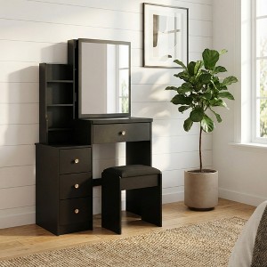 Transform your beauty routine with this elegant compact vanity desk. Its sleek black finish adds a touch of modernity while maximizing your space. Perfect for any bedroom setup, it provides ample storage with cleverly designed drawers and shelves. Tailored for the contemporary lifestyle, this piece is not only a functional space-saver but also an aesthetic centerpiece for your beauty essentials. Experience seamless organization with a design that combines style and practicality without compromise.