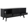 Add sleek style and a practical appeal to your space with Alatar media stand. The sleek modern profile and tapered legs of the media unit lend modern appeal to any room. The cabinets showcase a beautiful slatted surface to add visual interest and a breezy appeal. Showing off natural grains in a deep black finish, the sideboard remains a chic and versatile feature for any room. It includes cabinets, drawers, and open shelving to organize and keep all your media essentials within easy reach.