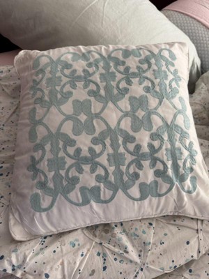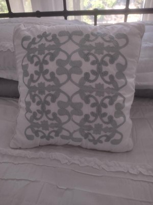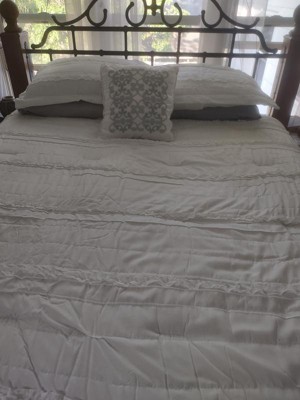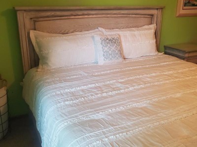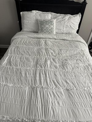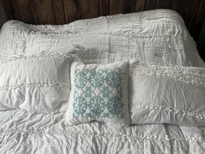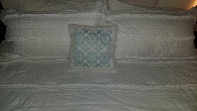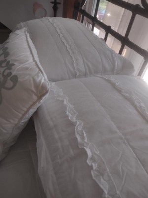 [This review was collected as part of a promotion.] We have a home on some acreage out in the country and it is decorated in a farmhouse style and this comforter set matches the style very well. It has two matching pillowcases and a throw pillow. The throw pillow has a design on it in a turquoise color, I would have preferred an all white/ruffley design instead.
