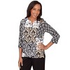 A striking patchwork of scroll and geometric motifs gives this top its bold character. The split neckline is accented with sparkling beading for an elegant touch, while three quarter sleeves and a straight hemline keep the silhouette classic. A blend of artistry and polish, it's a standout piece with graceful detail.