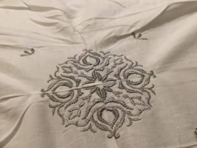 A: This comforter is reversible. The face of the comforter features tufted grey embroidery on an ivory base, while the reverse showcases an all-over grey medallion print that complements the top of the bed.