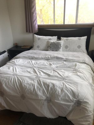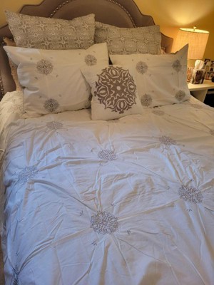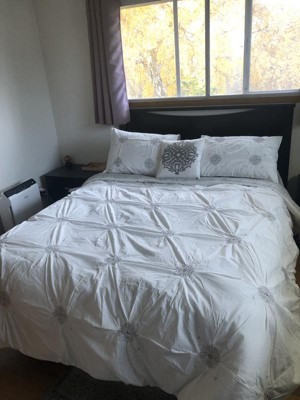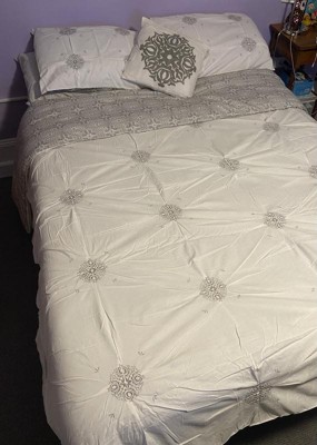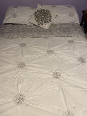 [This review was collected as part of a promotion.] The quality of this set is superb! Loved that it came with Euro shams and a decorative pillow! Another great bonus is that it is reversible to match the Euro Shams and the back side of the pillow shams! It is a very soft, nicely filled comforter that is nicely sized to fit my queen sized bed. So many comforters don't have enough width to cover the mattress but this one does! I love the design of white and grey and the medallions. I intend to use it during the winter season as it reminds me of snowflakes a bit. Would definitely recommend to anyone!