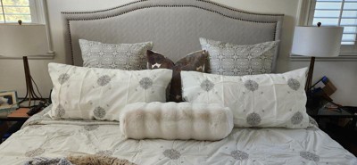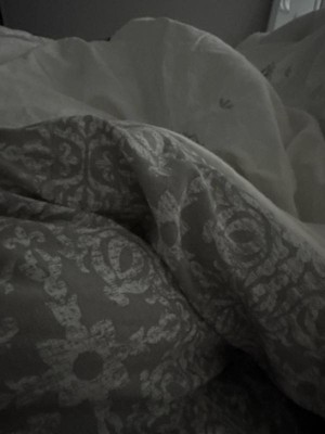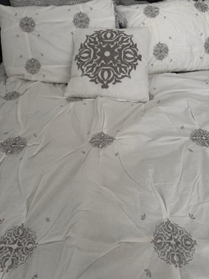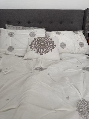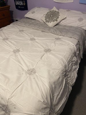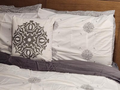 [This review was collected as part of a promotion.] Since I got this product for free from Influenster, it didn’t have an image of what the product looked like. Once it arrived it was different than I expected but still very pretty and elegant. It’s a white/cream color with silver/grey medallions on it and it’s reversible so the other side is a smaller grey medallion pattern. For the price this is a great set! A comforter, two queen pillowcases, two shams, and a decorative pillow! It’s soft and cozy and it looks to be made of good material!