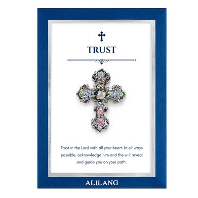 - Elegant Brooch: The gorgeous brooch pin is adorned with iridescent crystal rhinestones which reflect beautiful colors of blue, white, pink, and purple. Bonded onto an intricate, semi-hollow Latin style cross base with floral accents. The metal alloy materials are safe, hypoallergenic, and oxidation resistant. Features a secure and reliable pin closure. Pendant size 2.2 inch width x 2.75 inch height.