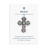 Cultivate inner peace and tranquility with the Iridescent Latin Cross Brooch Pin and Card Set. This beautiful gift combines a captivating symbol of faith with a message of divine peace and serenity. A dazzling iridescent cross brooch rests upon a white card featuring a heartfelt message about the peace of God. The multicolored rhinestone gems shimmer and sparkle with vibrant hues of blue, white, pink, and purple, creating a breathtaking and symbolic presentation. The card message reads: "The peace of God, which surpasses all understanding, will guard your hearts and your mind. Rejoice in the peace," accented with the word 'Peace' and a cross symbol at the top. Both the brooch and card are nestled securely inside a protective clear plastic bag. The entire presentation is then showcased in a charming navy blue envelope measuring 4.1 x 5.7 inches. The envelope features a convenient back flap closure and a unique front cutout with a silver border, allowing a glimpse of the lovely gift inside.