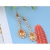 - Elegant Teardrop Design with Peach Crystal Accents: This exquisite set features a beautifully crafted gold tone necklace adorned with peach crystal teardrop accents. The crystals catch the light beautifully, adding a touch of sophistication and glamour to any outfit.