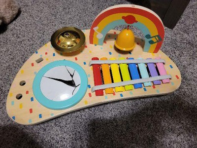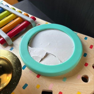 The drum broke 5 minutes after we took it out of the box. My 2 year old was playing with it and it smashed in. It's as thin as paper. Highly suggest finding a different instrument for kiddos to play with. I was so bummed, because this was a birthday present and it broke immediately. The idea of a decent priced all in one instrument table is brilliant. Just please for the love of everything, find something else to make the drum with.