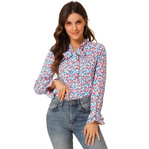Allegra K Women's Floral Tie V Neck Chiffon Ruffle Trumpet Sleeve Blouse - 1 of 4