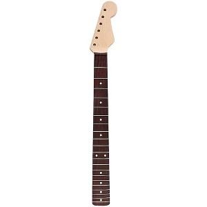 The Allparts SRO-62 Stratocaster Replacement Maple Neck with veneered rosewood fretboard is made for players who want a vintage-style feel and sound. It uses a real maple neck and has a rosewood layer on top where fingers touch the frets. This neck matches Fender’s 1962 design, down to the 7.25" fretboard radius and tall, narrow frets. The "lam cut" rosewood board gives more contact between the neck and fretboard, which makes the neck stiffer and more stable. The nut width is 1-5/8", so fingers have space to move, and get 21 frets for all favorite notes. The neck comes unfinished and ready for to add own finish. It fits vintage strat bodies and uses a round heel for easy installation.