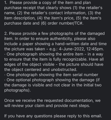 Promised one thing at Target store and when filing claim they said I bought the wrong insurance for my item and nothing is covered. I wasn’t told there were other insurances available to begin with. DO NOT BUY THIS FOR YOUR ITEMS. They do not work for anything but maybe electronics with water damage.