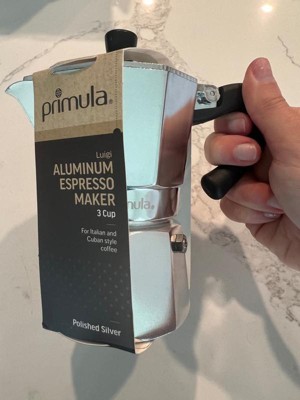 This Aluminum Stovetop Espresso Coffee Maker quickly produces 3 demitasse-size cup of rich, authentic espresso. Stovetop espresso makers are popular because you can make quality espresso without the hassle of electric espresso machines. This espresso maker takes up very little counter space, is easy to use, and delivers a fantastic cup of fresh, aromatic espresso. Primula’s distinctive design provides through and even heat distribution for enhanced flavor and aroma. Included in each box are easy step by step instructions to make the perfect cup of espresso the very first time. Simply fill the lower chamber with water, fill the filter with ground coffee, and place on medium heat atop your stove. Within minutes, a delicious bubbling cup of espresso will fill your pot. Remove from heat and enjoy or add milk for tasty lattes, cappuccinos, and mochas. This durable aluminum espresso maker features a safety-release valve, a major factor in controlling the quality of your espresso. It controls the pressure with which the water is delivered to the coffee grounds. If it is too low, your espresso will be under-extracted, but if it’s too high, over-extraction occurs. Primula’s design allows you to make a perfect cup of espresso in one pot without worry as the safety release valve controls the pressure at a set, pre-determined level. This sturdy espresso machine is carefully crafted of strong, long-lasting aluminum and features a durable flip-top lid with a temperature resistant knob and handle that allows for easy, safe pouring.