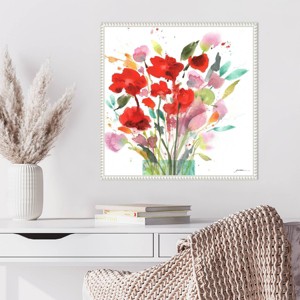 This image depicts a vibrant watercolor painting featuring an abstract arrangement of red flowers and green leaves. The delicate brushstrokes and fluid colors create a lively, fresh atmosphere. Splashes of various colors add a dynamic, modern touch to the composition. This canvas art print was created by Sheila Golden and printed in Waunakee, WI. The canvas is stretched by hand and finished with a float frame. Individually made using traditional custom framing techniques, it has the quality you would expect from your local frame shop.