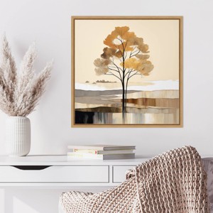 The image is a minimalist, contemporary artwork depicting a single tree with foliage in warm, autumnal colors. The tree is set against a tranquil, layered abstract landscape with earthy tones. The composition evokes a sense of calm and elegance. This canvas art print was created by Irena Orlov and printed in Waunakee, WI. The canvas is stretched by hand and finished with a float frame. Individually made using traditional custom framing techniques, it has the quality you would expect from your local frame shop.
