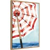 This watercolor painting depicts a view of a beach scene with a prominently featured umbrella. The umbrella has red and white stripes and is set against a backdrop of blue skies and hints of the ocean below. The scene evokes a sense of summer and relaxation by the seaside. This canvas art print was created by Mercedes Lopez Charro and printed in Waunakee, WI. It is stretched across a solid surface to resist sagging. We use only premium, high-tension canvas. Our exclusive stretching techniques hide corner folds and provide a taut canvas surface. The artwork is authentically licensed. The canvas appears as if it is floating in the frame because it has a narrow gap between the edge of the canvas and the frame. Our canvas items are individually made using traditional custom framing techniques, it has the quality you would expect from your local frame shop.