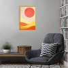 This artwork features a minimalist depiction of a desert landscape with rolling orange and yellow dunes. Above the dunes, a large red sun dominates the sky, emphasized by the silhouettes of several birds flying across. The composition uses bold, warm colors to create a serene and abstract representation of nature. This framed art print was created by Eins Kubistika and printed by Amanti Art in Madison WI. The print is giclee printed using fade-resistant inks for picture-perfect detail and incredible depth of color and finished with a 100% real wood frame. Individually made using traditional custom framing techniques, it has the quality you would expect from your local frame shop.