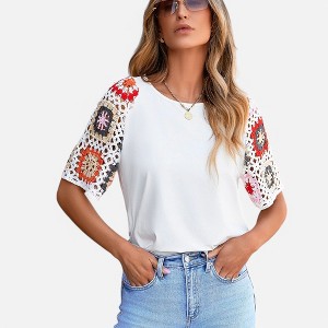 Amaryllis Women's Crochet Sleeve Top Relaxed Fit Boho Chic Short Sleeve Knit Detail Stylish Casual - 1 of 4