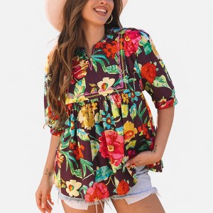 Amaryllis Women's Floral Embroidered Babydoll Blouse Half Sleeve Relaxed Fit Boho Top