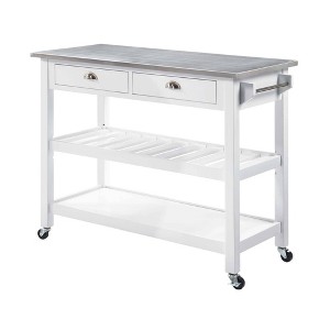The American Heritage 3 Tier Stainless Steel Kitchen Cart with Drawers by Breighton Home is the perfect addition to any transitional kitchen space. Providing functionality and efficiency for everyday tasks, this classic unit is sure to become a staple in your modern home. The smooth steel countertop is food safe and makes an ideal efficient food prep station. A stainless-steel towel rack keeps a towel nearby which allows for easy cleanup if needed. Two additional shelves and two spacious drawers on smooth ball-bearing slides offer all the storage one may need. The middle shelf has slats offering the perfect space to store wine bottles or other kitchenware. This finely crafted piece is perfect for anywhere you need a little extra storage or kitchen prep space. This portable cart is the perfect mobile storage space thanks to the 360-degree swivel caster wheels, two of which are locking. The countertop is made of stainless steel and the sturdy frame is engineered from solid wood to ensure long-time use. Available in multiple finishes, you are sure to find an American Heritage 3 Tier Stainless Steel Kitchen Cart with Drawers by Breighton Home to match your current existing interiors.
