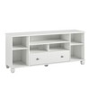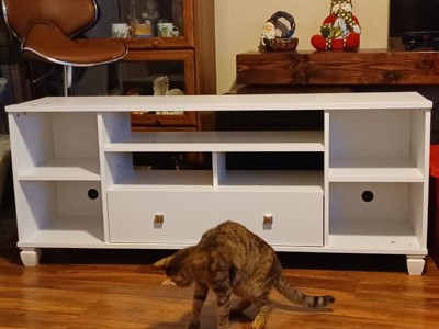 Beautify your living room with a gorgeously functional TV Stand for TVs up to 64". Available in a neutral finish and comprised of engineered wood, this TV stand has seven individual open storage cubbies, including a space for a sound bar. Two shelves are adjustable giving you the freedom to customize your component placement how you see fit. The lower drawer is an excellent storage solution for cords, remotes, or to stow away a blanket to cozy up to on movie nights with loved ones. The TV stand has been rated to fit most flat screen TVs up to 64" or up to 95 lbs. and ships flat to your door in one box. The TV Console requires assembly and two adults are recommended to assemble. Once assembled, the Stand measures to be 59.61" W x 15.67" D x 24.29" H.